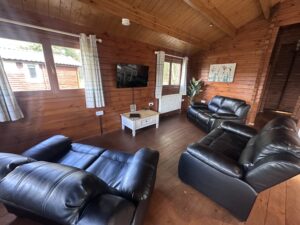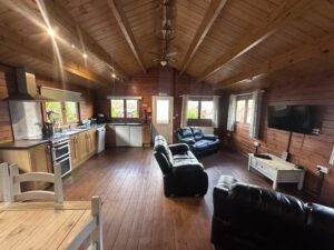 Woodpecker is our only pet friendly three bedroom cabin. It has a double bed bedroom, a twin bed bedroom and a bunk beds bedroom. Allowing you a maximum of 4adults and 2kids in this cabin. We only allow children on the bunk beds. It’s an open plan kitchen and living area with sofas, TV, dining table and chairs. Kitchen is equipped with everything you need for a self catering break. Bathroom has a shower. Patio doors from the living area leads to your private gated side garden. There is table and chairs, a stone BBQ and a wonderful large covered and under shelter large round hot tub to enjoy come rain or shine.