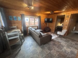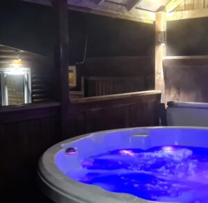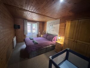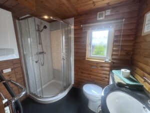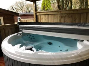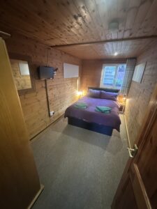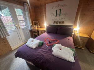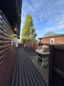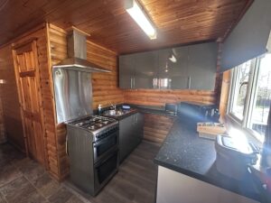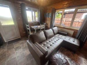 Two double bed bedrooms. It has an open plan kitchen and living area with sofas, TV, dining table and chairs. Kitchen is equipped with everything you need for a self catering break. Bathroom has a shower. Patio doors from the master bedroom leads to your private gated back garden. There is table and chairs, a stone BBQ and a wonderful large covered under shelter large round hot tub to enjoy come rain or shine. This cabin doesn’t allow pets. (disposable BBQ’s to be used only) unless BBQ Cleaning has been paid for.